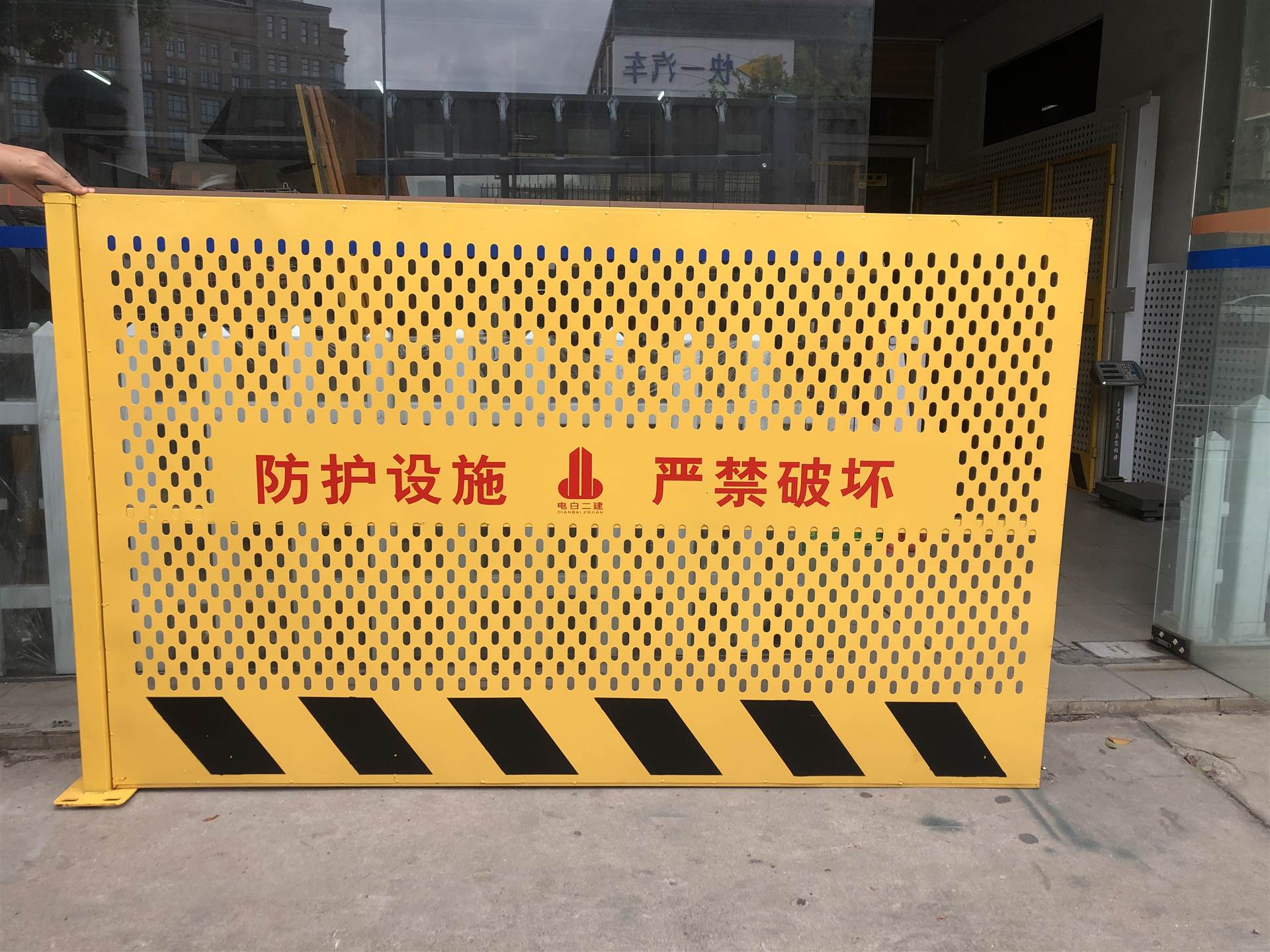 安装工地基坑护栏后,护栏上侧与立柱齐平,下侧离地面2cm,两立柱之间的距离为2m。采用规范材质,严苛按照图纸生产,尺寸正确,焊接点稳固,达到安全防护的目的。